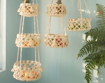 Macrame Hanging Fruit Basket Upcycled Sari In 2021 Hanging Fruit Baskets Fruit Basket Fruit Storage
